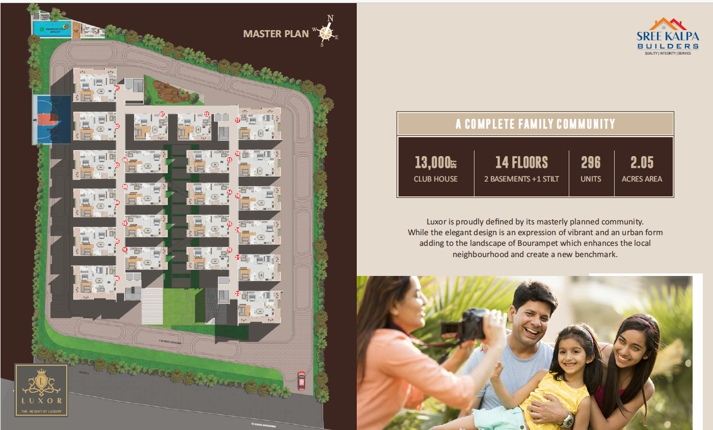 Sree Kalpa’s Luxor, is the embodiment of luxury and a refined lifestyle with excellent internal and external amenities making your living to fullest. Located in the lovely residential neighborhood of Pragathi Nagar and Bachupally, you’re just a few minutes away from numerous conveniences.
